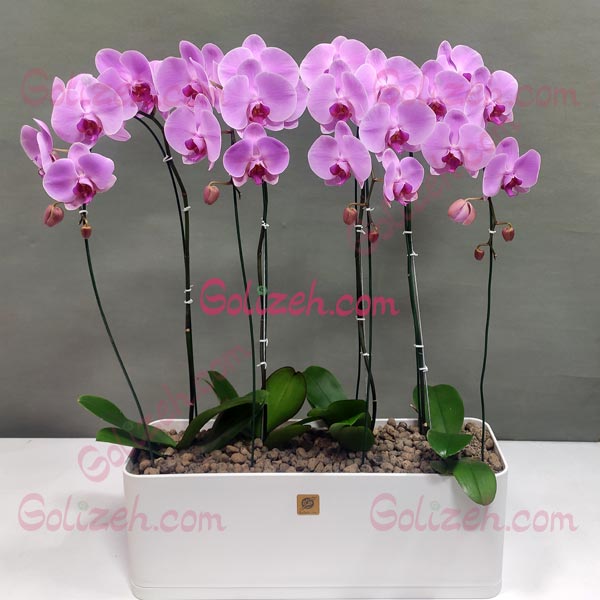 گیاه ارکیده بنفش 4بوته از چهار عدد گیاه ارکیده تشکیل شده که در یک گلدان مستطیلی شکل کاشته شده اند.