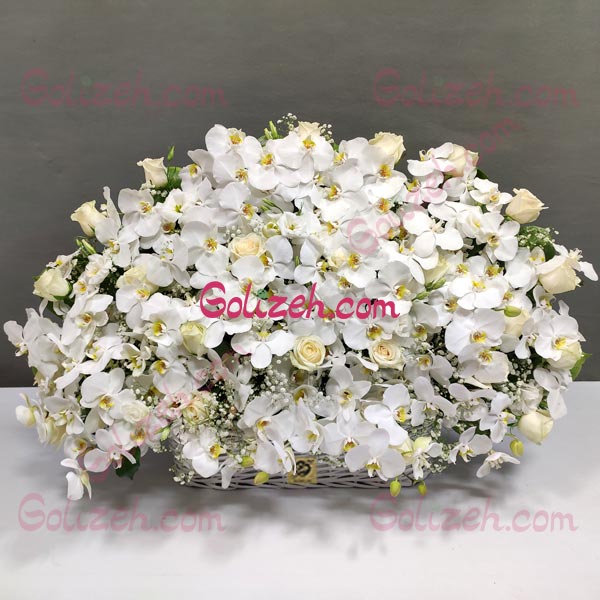 سبد گل ارکیده با تم رنگی سفید از ترکیب گل های ارکیده ، رز و آلسترومریا در کنار شکوفه های زیبای ژیپسوفیلیا تشکیل شده است.