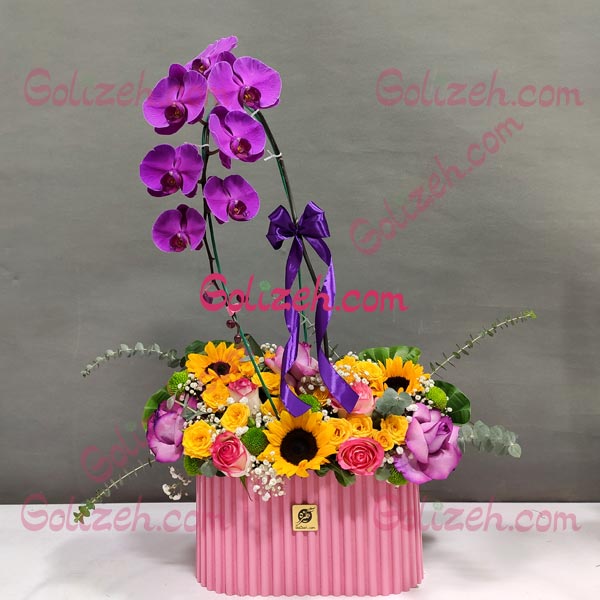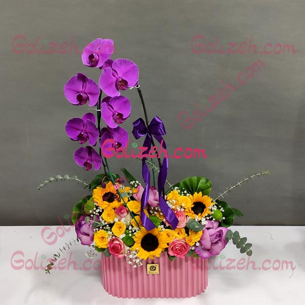 ارکیده ویولت یک باکس گل زیبا با طراحی یکطرفه، از گل های ارکیده، آفتابگردان و رز که بسیار جذاب و باطراوت بوده و می توان از آن در مناسبت های مختلف بهره برد.