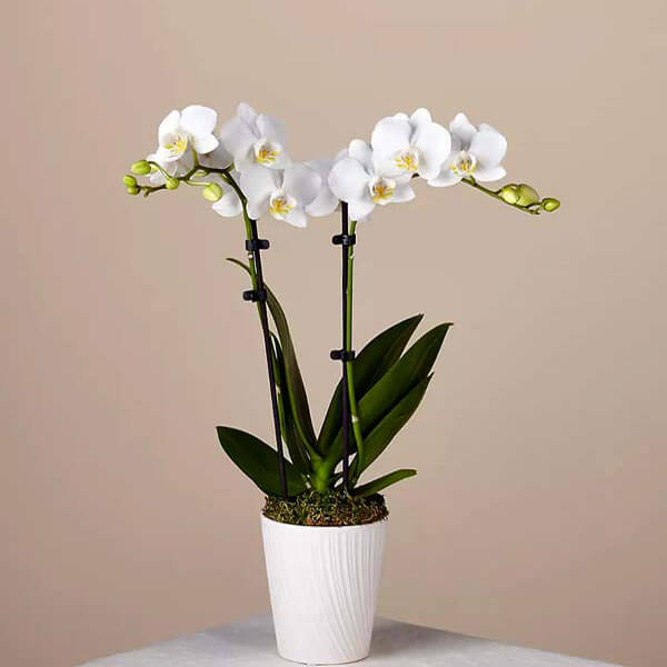 - گل ارکیده سفید دو شاخه با ارتفاع حدود ۶۰ الی ۸۰ سانتی متر از کف گلدان
